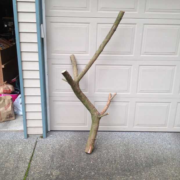 Corte de la rama, luego cortó todas las ramas secundarias que parecen demasiado débiles para apoyar un rama artificial más tarde. Podría dejar una o dos ramas muertas intactas de verosimilitud. No lo hice.