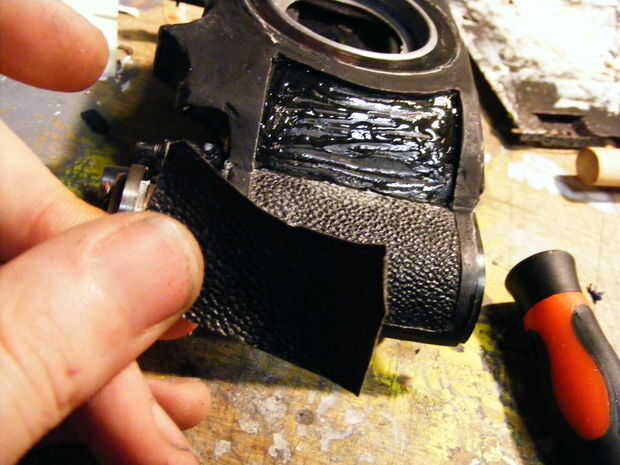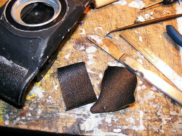 para hacer la cámara como un dispositivo permanente, el diseño original se lleva sobre los nuevos materiales. piezas de cuero de una cámara similar son cortadas con cuchillas y tijeras, con un proceso de adjust(trim) y prueba de ajuste. adhesivo de contacto pega en su lugar.