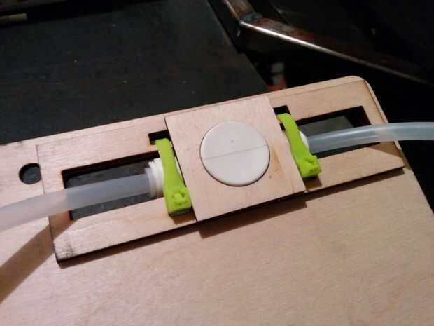 Montaje es muy fácil. Pegue las dos placas de refuerzo alrededor del orificio de la válvula. Éstos sirven a construido un collar que la válvula pueda sentarse, evitando que se tuerce. Las ranuras pequeñas en ambos lados permiten una sujeción de cable pase a través, sosteniéndolo en lugar. Pegar el piñon grande en el cabezal de la válvula y atornille el cuerno del servo en el piñón pequeño. Atornille el servo en su lugar.