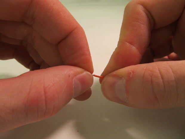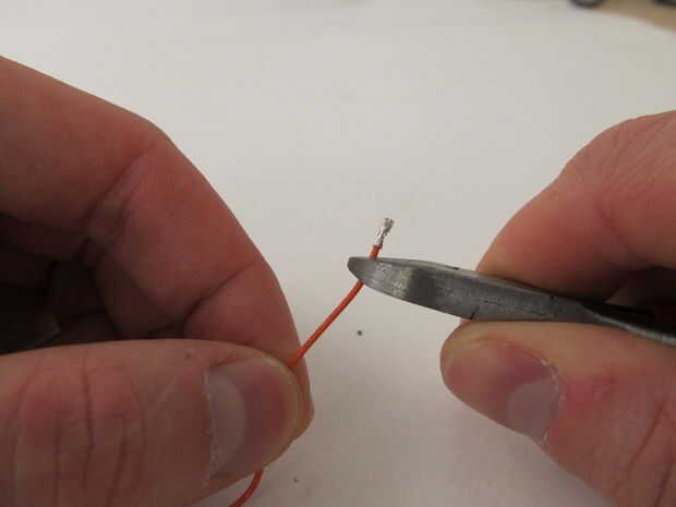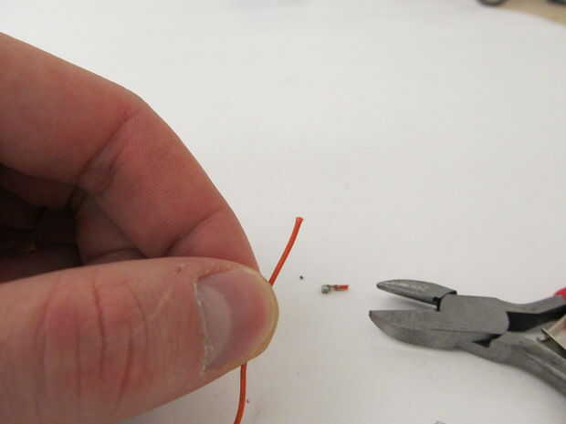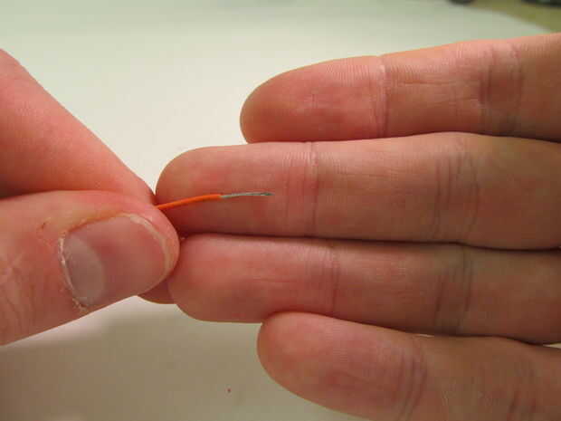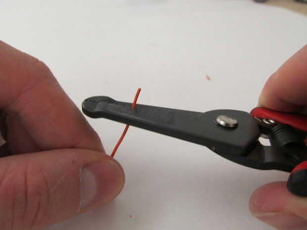 En primer lugar, ser generosos con cuánto alambre tira. Vamos a querer utilizar estos extremos para envolver alrededor de los cables de los conectores, así que tira de tal vez 3/8 a 1/2 pulgadas (o 1 cm para las personas con un sistema más civilizado).