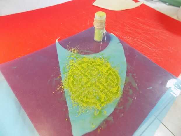 Cuidadosamente y lentamente, levante la plantilla. Despegue de un lado. El exceso de polvo se derrame en áreas previamente no expuestas.