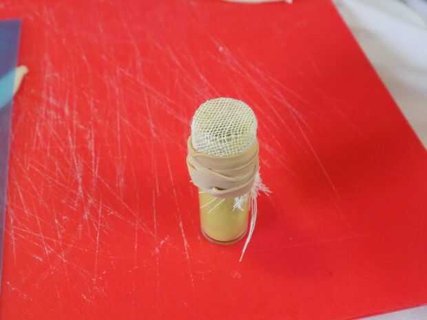 No tengo un plumero de harina, así que poner un trozo de tela de queso por encima de los polvos de talco y había celebrada con una banda elástica.