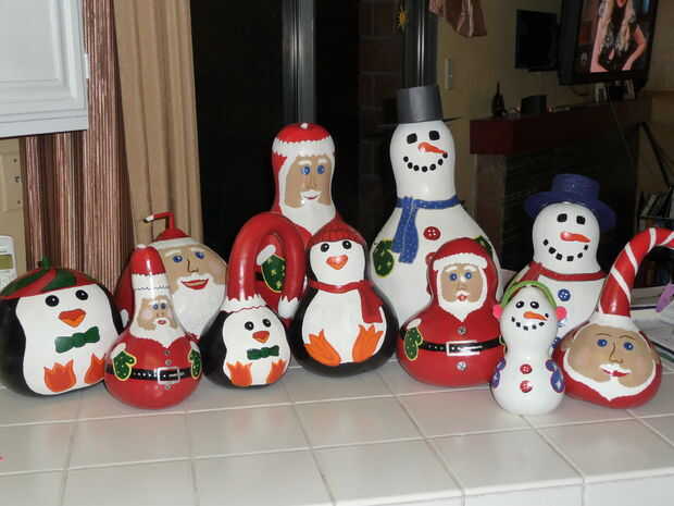 Así que de nuevo en octubre llené mi carretilla con una calabaza o dos y un montón de calabazas para pintar. Las calabazas pueden ser esférica, en forma de cacahuete, puntiagudos, etc.. Trato de elegir una variedad de formas y tamaños. Tomar una calabaza y lo mira. ¿Su forma sugiere nada? ¿Un elfo de muñeco de nieve, Santa? Tal vez un Jack-o-lantern, una pieza de fruta o un pájaro.