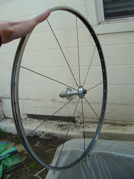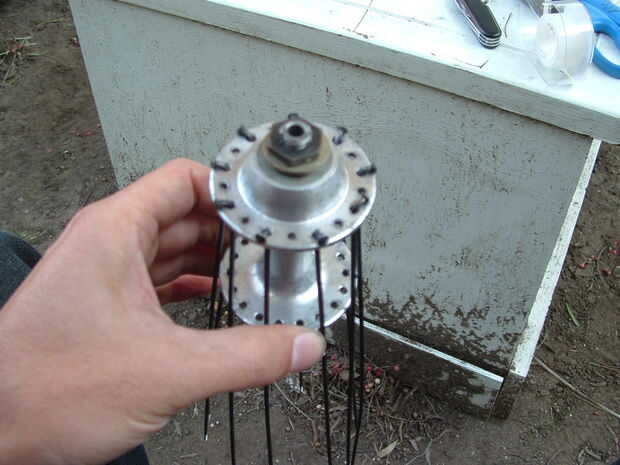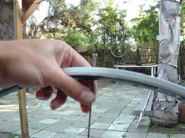 El centro, tomar el rayo siguiente y hacer lo mismo en el agujero del borde cuatro espacios de la primera. Continúe hasta que todos los radios se unen a la llanta con pezones habló. Debe tener tres agujeros abiertos entre cada conjunto de radios.