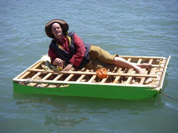 Súbete. Es muy estable. Cuando baje una esquina un poco de agua se filtra en a través de agujeros en la parte delantera donde perdimos la pintura o el paño cambió de puesto de amarre.