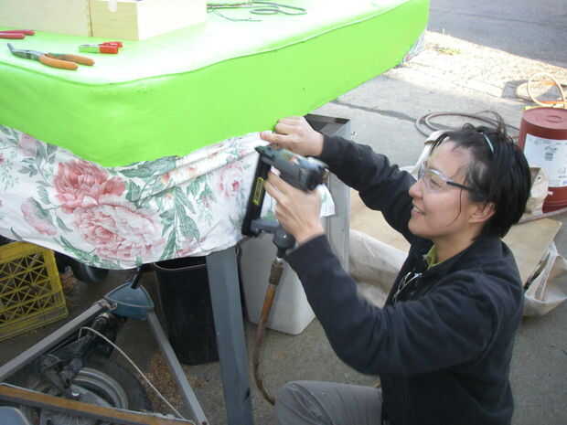 Las obras de barco tan bien vale para reparar y hacerlo aún mejor. Jane Lee cose y grapas un parche de una sábana vieja sobre el agujero más grande. Staplegun es genial. Pero todo el mundo deja de hablar y se aleja cuando se está utilizando.
