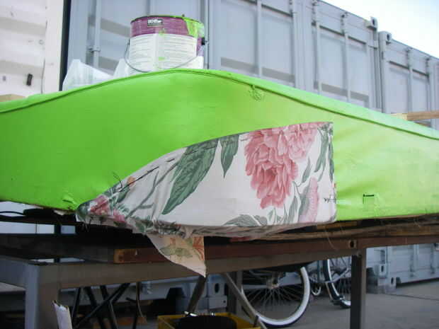 No mucho, sólo manchar algunos pintura allí. Hacer mucho debajo de los bordes del parche para sostener hacia abajo. Gritos de lamento se oyen que el patrón floral de la hoja consigue oculta bajo la pintura.
