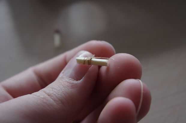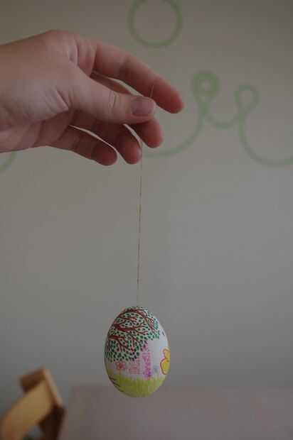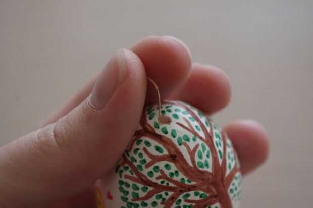 Tomé a un partido y cortar aproximadamente 1 cm. Luego adjunto mi hilo de coser a la pieza de partido y ponerlo abajo de la parte superior del huevo. Agitar un poco el huevo y el partido debe ser seguro. Ahora usted puede colgar su huevo.