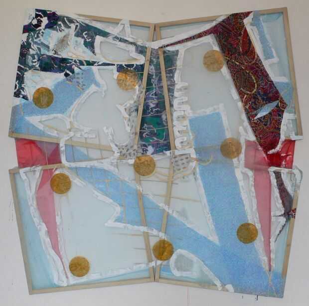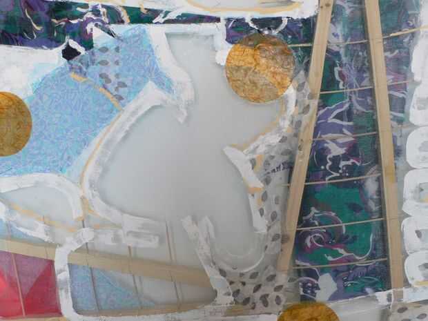 Las telas proporcionan una superficie sobre la cual se aplica pintura acrílica y se pegan círculos de papel de morera. La pintura de la malla de nylon transparente parece colgar en el aire, los agujeros de la malla son lo suficientemente pequeños como para soportar la superficie de la pintura.