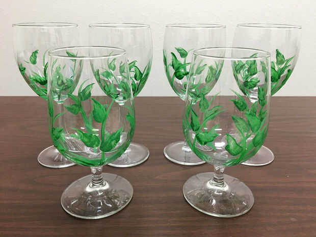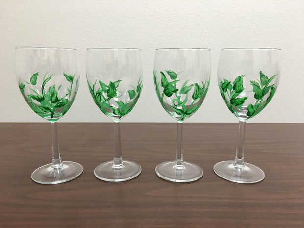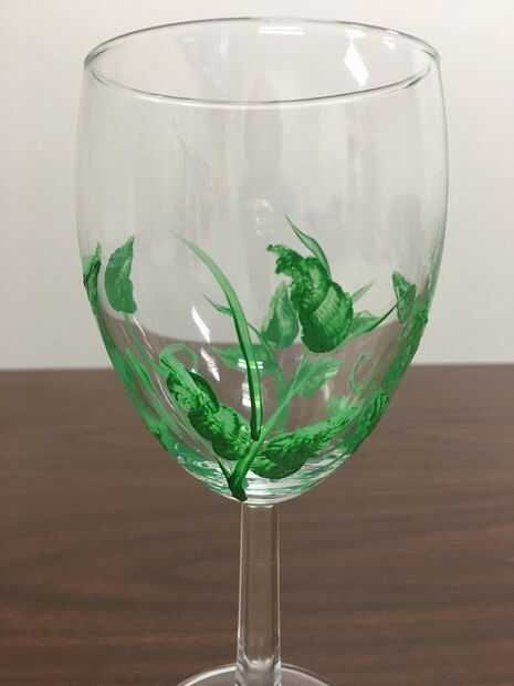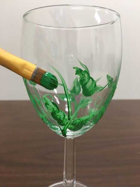 Carga la pintura verde sobre el cepillo y a partir de la base de la hoja, presione el pincel sobre el vidrio y lentamente lo mueva como se mueve hacia fuera y hacia arriba hacia el punto, liberando como usted tuerce.