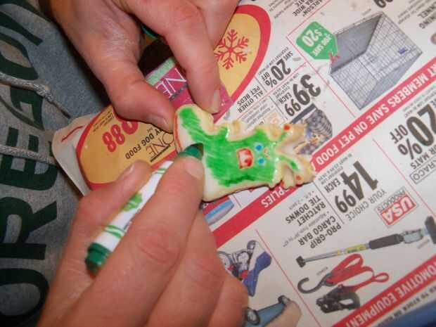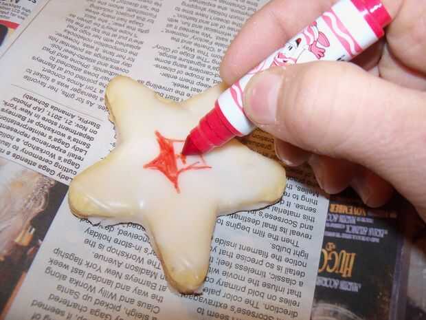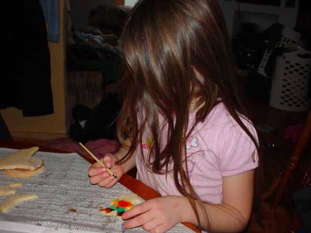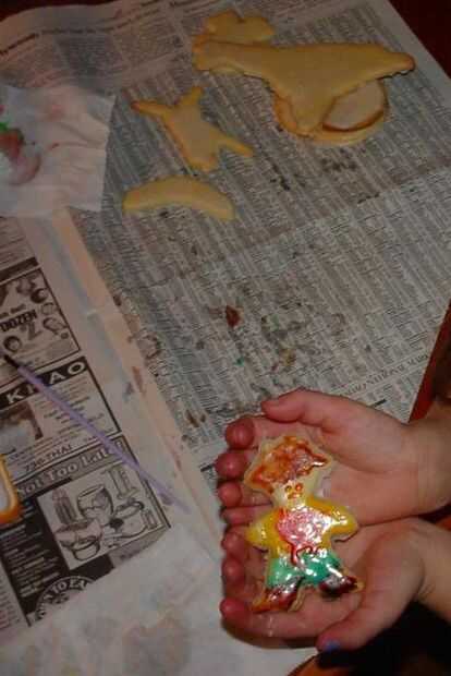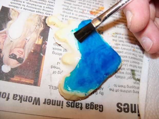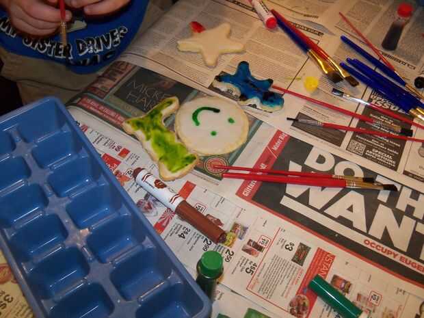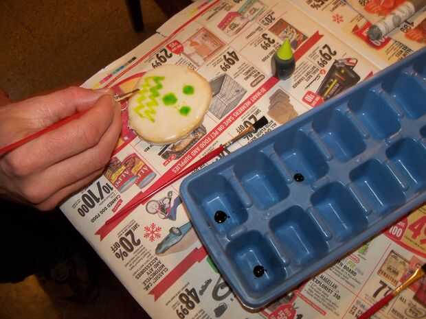 Coge un bol pequeño o una tapa de plástico (o un cubito de hielo), un par de tazas de agua, pinturas, pinceles y palillos de dientes. Colocar las galletas en el periódico y pintarlos delicadamente. Si el esmalte salido bien, han endurecido en una hoja lisa encima de la galleta, ideal para pintura en. Utilice la taza o tapa como una paleta mezclar el colorante en.