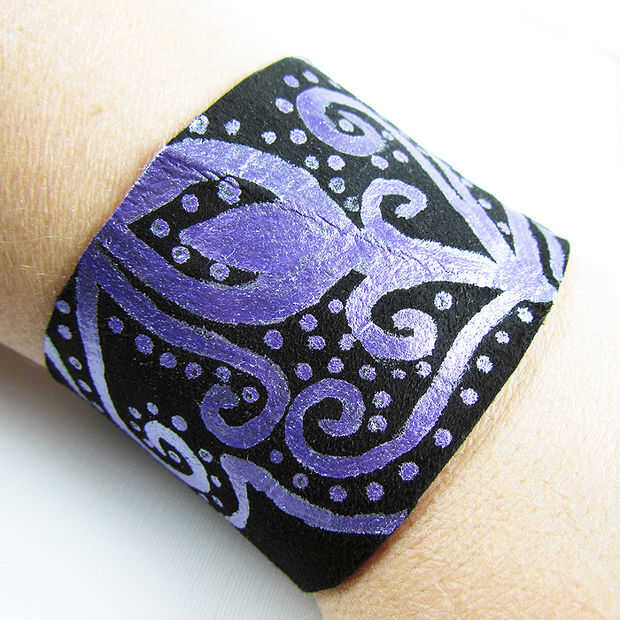 para esta pulsera usé pintura arte de acrílico para poner un diseño a mano alzada en un pedazo de gamuza media/delgada. El cierre, por ahora, es auta adhesivo fuerza industrial velcro. Usé velcro para que sea ajustable. Probablemente yo a coser el velcro más adelante, pero sólo si no causa la pulsera a bee demasiado rígido o incómodo mientras se está usando.