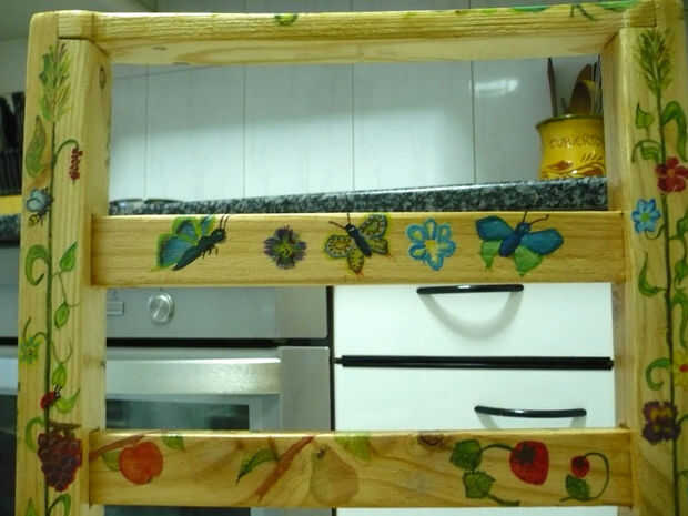 Cuando veo que se repiten flores, una mariposa. Pero, ¿cómo se pinta una mariposa? La respuesta, como de costumbre, mi esposa lo tiene. Ella me trae una revista de punto de Cruz. Es fácil de copiar el dibujo y me da una idea de los colores.