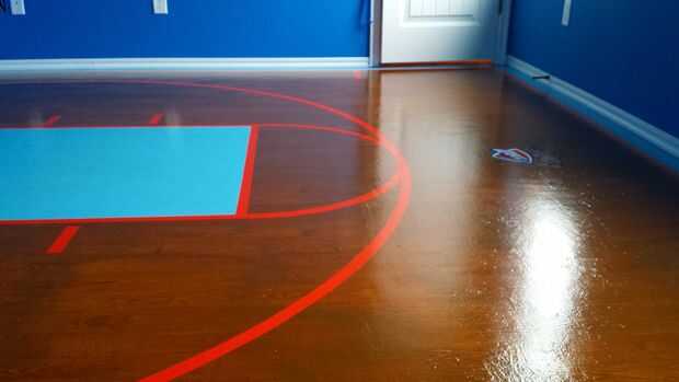 Una de las habitaciones que hicimos era dormitorio de mi hija, una cancha de básquet pintado a mano. Leer a lo largo de como te muestro los pasos que pasamos. Como describo cada paso, te agrego enlaces a nuestro sitio/blog que dará mucha más información que el proceso resumido listado aquí.