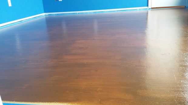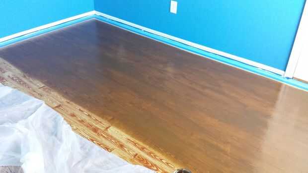 Ahora es tiempo para las manchas. Usaremos dos tipos de tintura de esta planta, una mancha de gel para crear el grano de madera y una mancha de madera para cubrir todo el piso. Asegúrese de utilizar los colores que se complementan entre sí, o usted puede terminar con contraste mucho más (o no) que usted había pensado.
