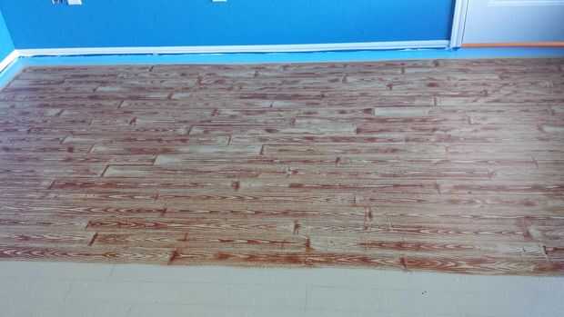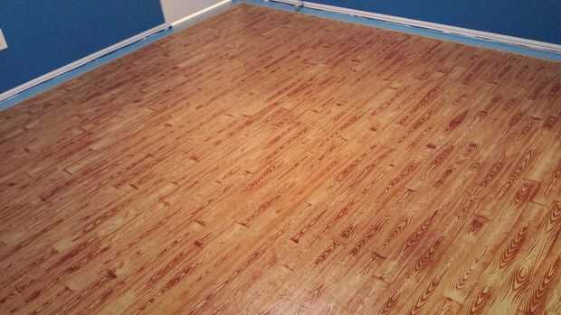 Usando una variedad de técnicas, comenzar a aplicar el colorante de gel, un tablón a la vez. Esto es importante ya que crea una separación natural entre los tablones y hace cada uno individualmente. Si no estás contentos con el resultado, simplemente volver sobre él otra vez hasta llegar a la Junta que te gusta! Una vez que has aplicado el grano de madera, asegúrese de dar el piso un montón de tiempo para secar el gel es a base de aceite. Nosotros dimos 48 horas y era todavía un poco hortera.