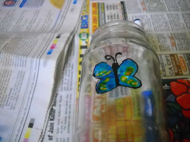 Usar el outliner negro o pintura para trazar el diseño que hiciste y separar los colores que se rellena. Espere que se seque durante 20 minutos si quieres limpio. Ahora rellene colores en un solo lado o goteará fuera del contorno. Para ello mantener el frasco en mis alicates cuando se abren un poco ya que actúa como un soporte. Otra vez dejarlo secar durante un combate de una hora. Repita en los lados restantes más adelante. Esta parte me tomó de un día entero para hacer. Hasta entonces el paso 3 Si usted está tomando la opción.