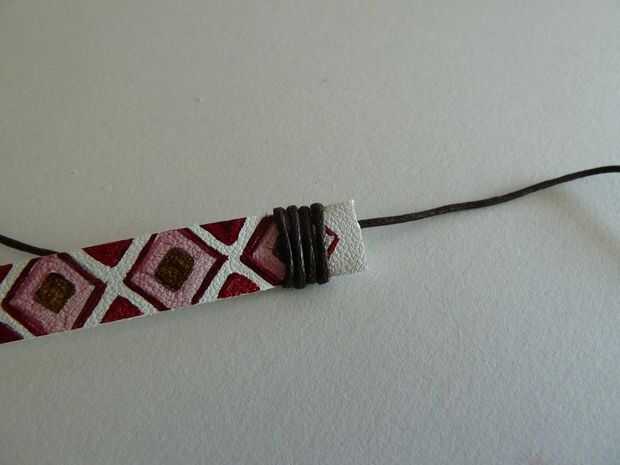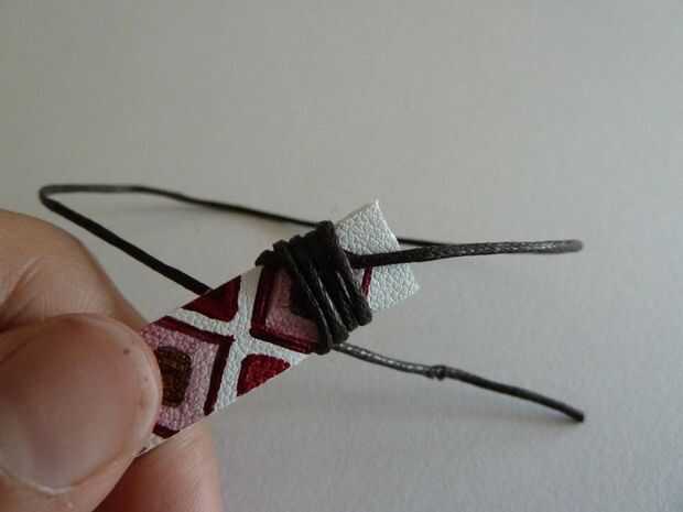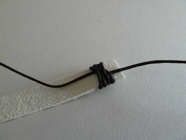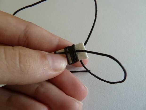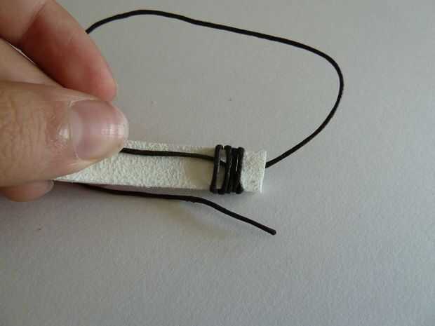 Después de envolver el cable, hacia la parte posterior de tu pulsera. El extremo por debajo de la broca envuelta y manténgalo allí. Como se puede ver en el tercer cuadro, el otro extremo de la cuerda se movió un poco al lado. Deslice con cuidado la cara y en la parte posterior de la pulsera.