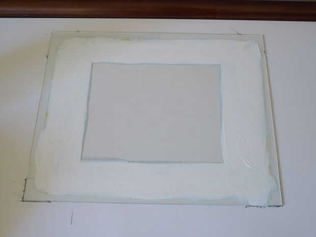 La segunda imagen muestra cómo aplica la capa base. Usé mucho el acrílico blanco para pintar toda la zona que es la zona de"a pintar". Asegúrese y realmente cruzar a la zona centro por aproximadamente 1/4" o 1/2". Esto asegurará que el borde de la foto no es visible. También apliqué 2 capas de blanco de grosor extra.