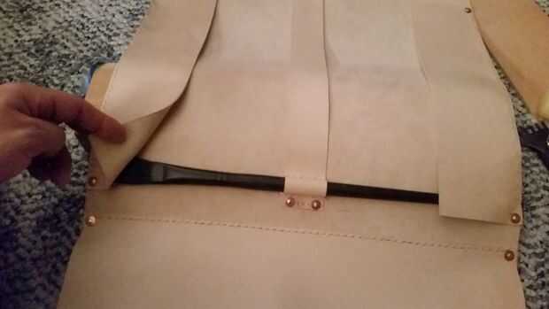 Con la bolsa completa, he trabajado en la adición de las aletas laterales. Que se corte la longitud de la zona y clavado en cada extremo. Utilicé una regla y un lápiz a línea de la costura, como el cuero era demasiado fino para usar la gubia.