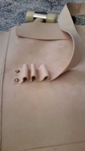El siguiente paso fue trabajar en el bucle. Había iniciado por cortar una tira apenas más ancha que el cincel 6-hole-punch y remachadas al final. Luego añadí uno parece justo contra los remaches, originalmente iba a coser sobre la tira, pero requeriría un golpe extra y luego, mucho más la costura.