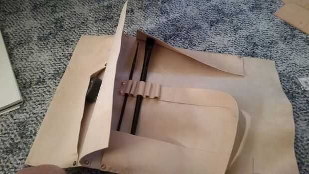 Presiona el cepillo hasta firmemente contra parece cosido, luego se deslizó hacia fuera, lado de la cerda, por lo que fue un poco más delgado, entonces el cincel firme contra el cepillo. Poner en un trozo de 2 x 4 y algunos cuero de desecho (para proteger la parte posterior desde el beat hasta la madera), dio el golpe de cincel una huelga o tres. El cuero era bastante delgado, así que no requiere tanto de un golpe.