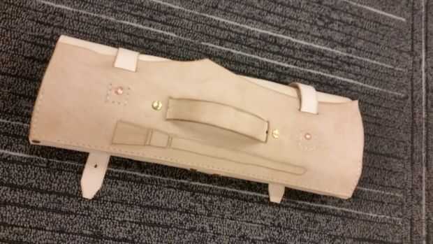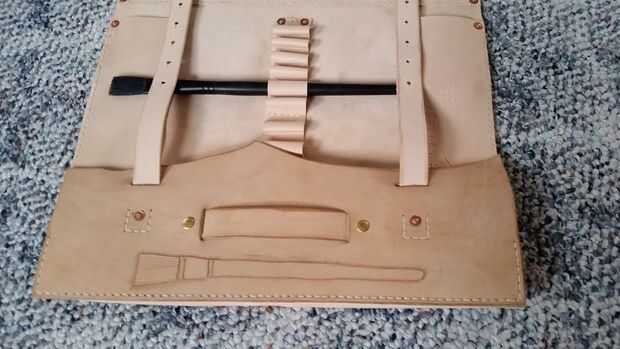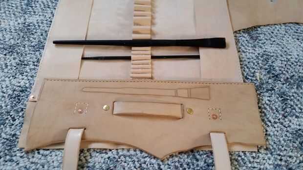 Las correas de sujeción fueron cortadas de una longitud de corte, 1" correa de Tandy. Debatí sobre cómo asegurar el rollo cerrado--el DTC, utiliza dos delgadas, tiras de tela atadas a mano. A veces esto es cansino, especialmente cuando hay una última herramienta que olvidó guardar. Se establecieron en el tamaño de 1", estéticamente es una relación atractiva para el tamaño del ancho del rollo. Fui con botones, pero no estaba demasiado seguro de donde colocarlos, o cuánto tiempo, ya que no estaba demasiado claro cómo grueso que el rollo sería una vez que se cargó con pinceles y fuentes. Colocó en aproximadamente 8" por su longitud y aproximadamente 1/4 forma desde el lado opuesto para los botones. Pensé que podrían cortar las correas más cortas, o los botones de mover si es necesario.