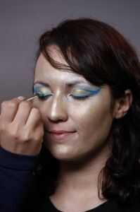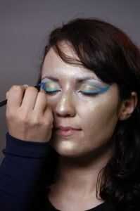 Volver al dorado oro y use un cepillo de cincel ancho para superponer el contorno turquesa. Deje seco, entonces use un cepillo #6 y el Catalina Blue para delinear los ojos una vez más, y luego mezcla con un cepillo de cincel.