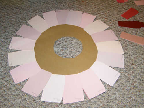 he usado muestras de pintura Dutch Boy de mi tienda local de comestibles. Esto funcionó muy bien porque eran perforadas y me vino aparte fácilmente. Si no puede encontrar tiras perforadas, simplemente cortar aparte en cada color diferente. Porque tenía una muestra grande en cada uno, yo utilizó esto como la capa del principio de la corona. Fui y había aventada, no prestar atención al color. (Puede ser más coordinado.) Usé un pedazo de cinta de doble cara en esta corona porque estaba trabajando con productos de papel y tenía miedo de pegamento caliente podría ser demasiado caliente. (Esto también trabajó bien porque la corona no es salir a la calle).