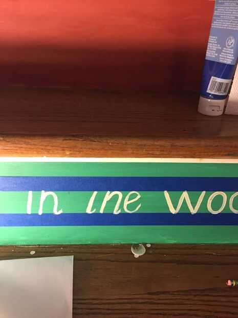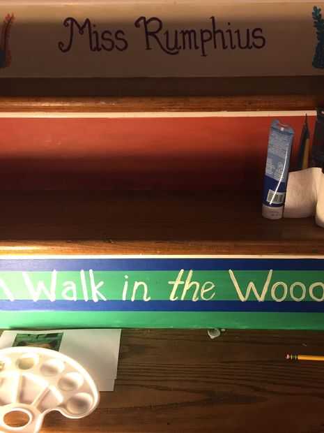 Por el título de un paseo en el bosque, conté 19 Letras y espacios, por lo que el centro del título era el espacio entre la palabra "en" y "el". Esto significó la primera carta empecé a pintar fue la t en "el" pero comenzó un poco a la derecha de mi punto central, como el espacio entre las palabras era el verdadero centro. Acabado de pintura a la derecha del título.