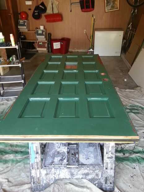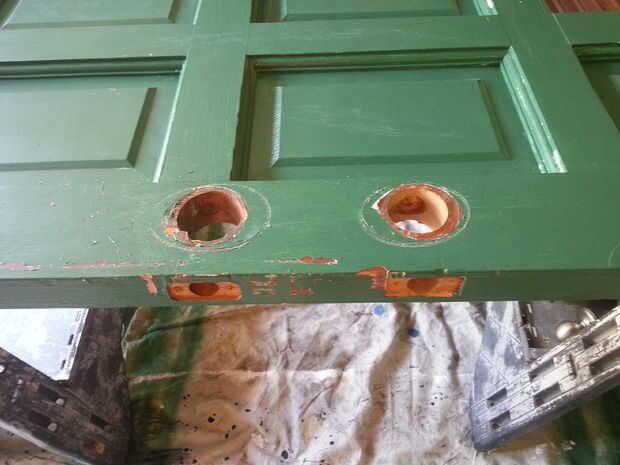 Cubren el suelo y ponga la puerta sobre dos caballetes. Enmascare las áreas que no serán pintadas con cinta de enmascarar. Quite el pomo/cerrojo de la puerta. (Conservé mis bisagras encendido y sólo enmascaradas sobre ellos).