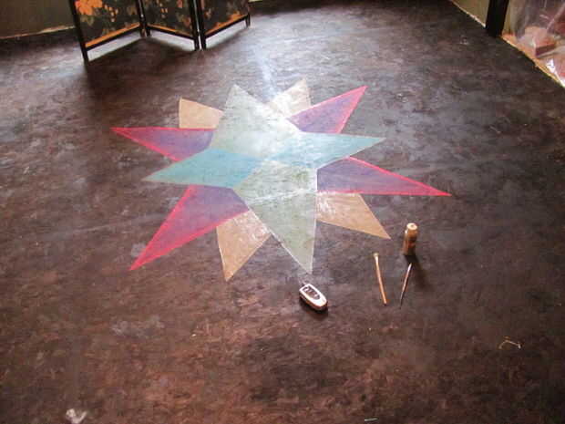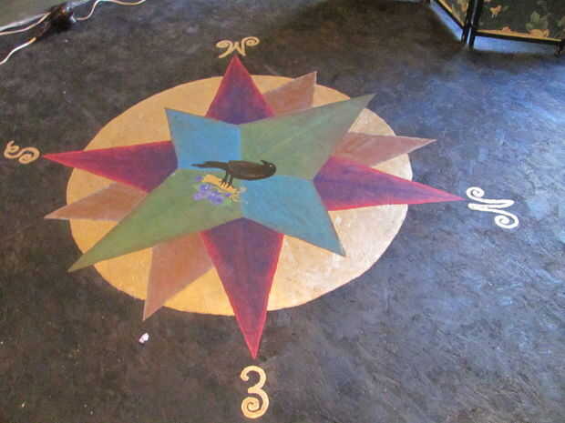 Ahora ¿qué? Mi esposo sugirió "los azulejos, el palillo abajo tipo"... no es exactamente lo que estaba pensando. Quería un piso pintado, y sabía el diseño que quería dab justo en el centro de la planta. ¿Mencioné que era una habitación pequeña? Quería que mi diseño sea frente y al centro, no cubiertos con tablas, etc..