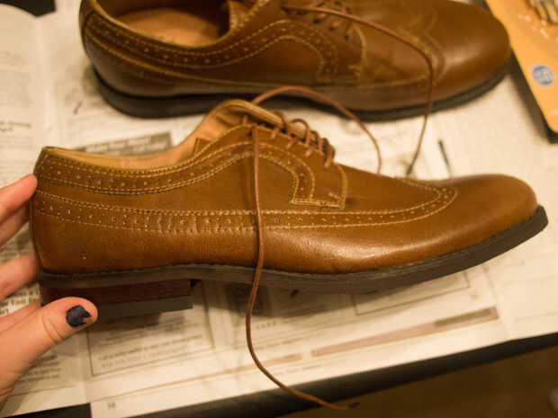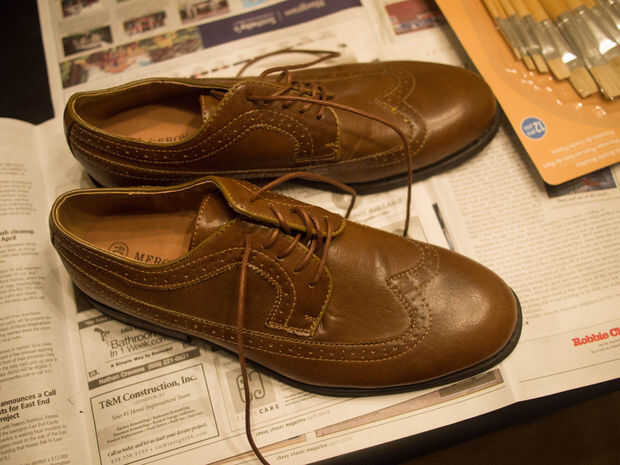 Algo que podría ayudar a que no hice fue colocar la cartilla en el zapato para hacer áspera la superficie. Probablemente sería una superficie tan pulida la pintura más fácil.