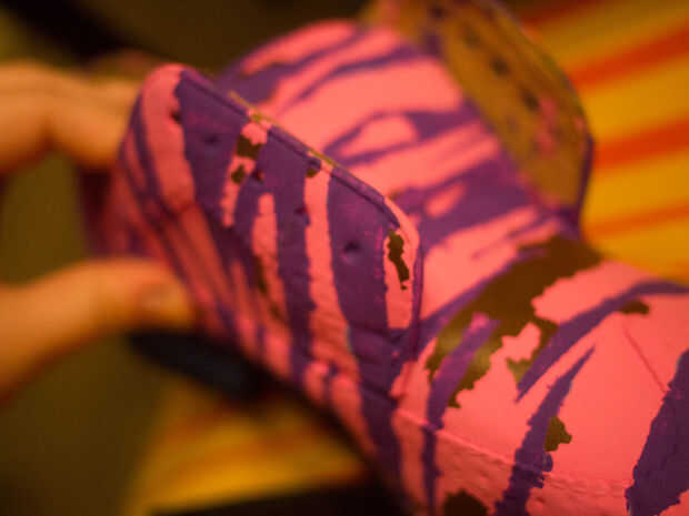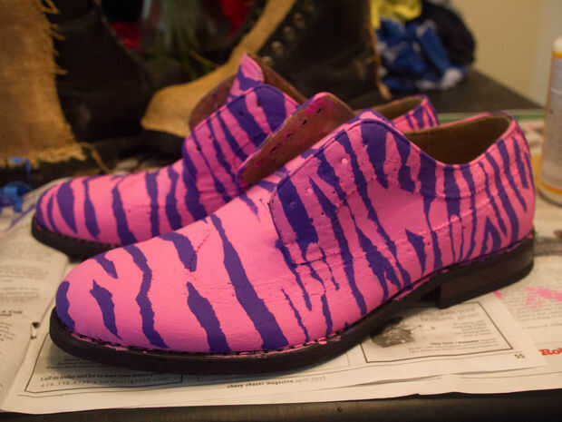 El proceso de quitar la cinta dejó algunos agujeros en la pintura, y también hubo corrimiento de donde consiguió la pintura debajo de la cinta. Algunos lugares eran realmente bastante duro, pero las líneas eran lo que quería--una idea general de lo que parecían rayas de la cebra que me permitió a color en las partes donde la pintura había sido despojada de.