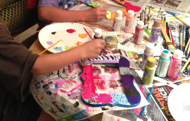 Estación de trabajo (mesa de la cocina está bien, pero solo cubren cada pulgada con periódico. Mis hijas son buenas con la pintura, pero todavía guarda una o dos veces).