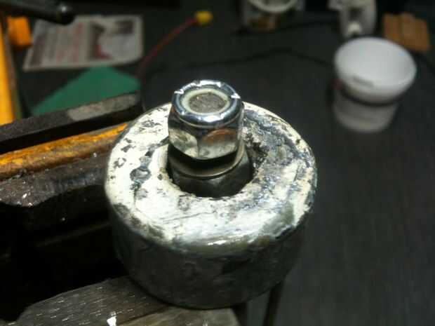 Deslice una arandela sobre el extremo roscado, luego la tuerca de 5/16 como separador, luego la tuerca de fijación ¼. No sobre apriete la contratuerca sólo cómoda.