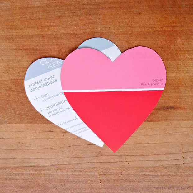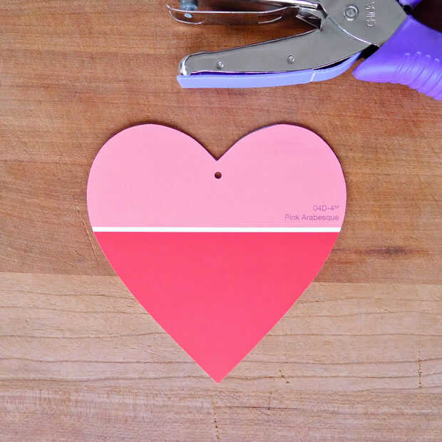 2. Utilizando una perforadora de papel pequeña, perfore agujeros todo alrededor de los corazones de chip de pintura con sobre 1/2 pulgada de espacio.