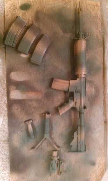 Una vez seca esta capa, comenzar a añadir el soporte a etiquetas engomadas grandes. Estos deben cubrir aproximadamente la mitad de la superficie total del rifle, así que liberal al aplicarlos. Trata de cubrir sus pendientes por lo que se destacan cuando su trabajo de pintura.