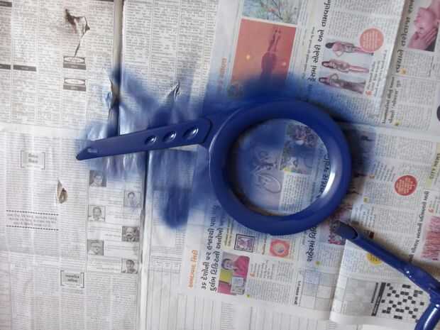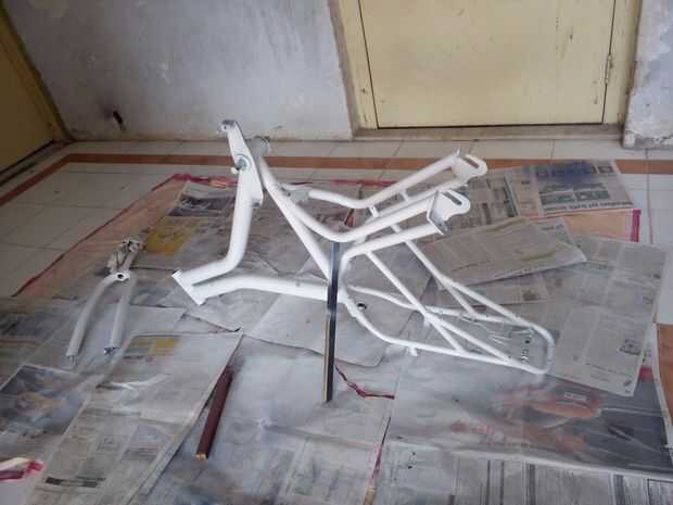 Todo lo ha hecho, ahora vamos a la pintura. Proteger el entorno diario. Elegir el color que desee. Agite la lata vigorosamente por 1 minuto punto la poder del aerosol hacia el objeto. Pintar en un constante y barrer y evitar goteos de pintura. Mantenga una distancia de 9 a 12pulgadas distancia entre la lata de aerosol y de la bicicleta. Aplicar 3-4 finas capas algo 1 capa pesada. Espere 5-10 minutos después de aplicar una capa y luego pintar la segunda capa. Evitar goteos de pintura y recubrimiento. Usé 2 lata de spray blanco y utiliza 1 lata azul.