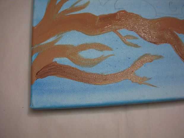 Por las ramas. He añadido un poco de crema a marrón para hacer un tono ligeramente más claro de marrón. Esta manera, no mezcla demasiado con el búho. Utilizando un pincel medio, mano libre la rama para que pasa a través de la página y bajo los pies de la lechuza. Añadir unas ramas más pequeños si quieres. Mientras que el marrón claro está todavía húmedo, añadir un marrón oscuro a la parte inferior de las ramas. Mezcla en la lona.