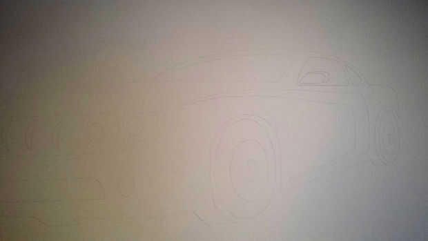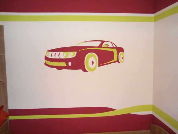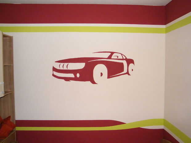 Utilizando un conjunto de pinceles de diferentes tamaños pintados a dos colores del coche en la pared.