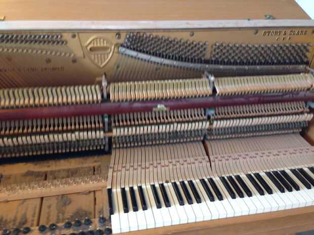 6. Usando una aspiradora o cepillo de quitar los años de polvo y probable invención que está debajo de las teclas. (Tenga cuidado de no aspirar los fieltros verdes y rojos. Estos se fijan a la altura exacta y sólo se pueden hacer por un afinador de pianos.