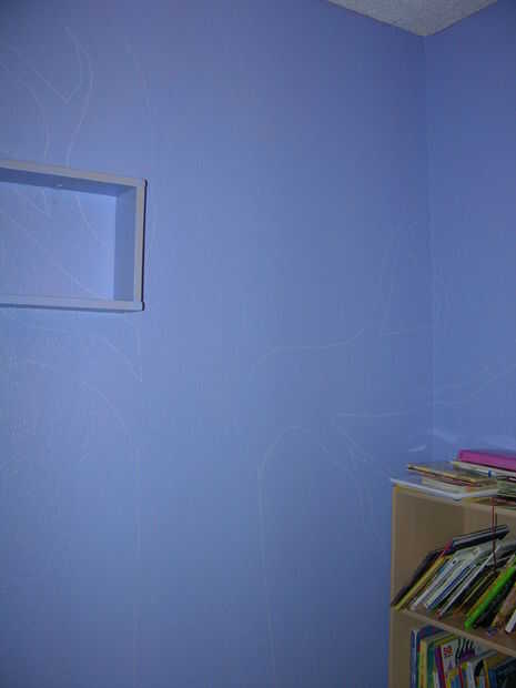 Era un poco demasiado pollo a pincel para pared sin algún tipo de guía, así que mi primer reto fue esbozar un esquema de mi árbol. Tiza es la mejor opción para este paso. Cualquier cosa puede tomar las paredes con facilidad. Sugiero usando tela y algo seco. Marcar con tiza en superficies mojadas es repulsivo.