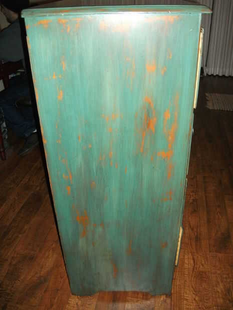 Después de la pintura se seca, el aparador de arena con papel de grano arena 220 con una lijadora eléctrica Palma. Esto es para mezclar pintura Junta, arena los bordes pintados y desnudas puntos. Bordes afilados y las esquinas para darle un aspecto envejecido desgastado de la arena. Este paso hace una gran diferencia en la apariencia por lo que puedes agregar tu toque creativo. Limpie todo el polvo. Aplique pintura con un trapo y limpie el exceso inmediatamente con un trapo seco. Permitir que la mancha se seque durante la noche.  Aplicar 2-3 capas de acabado transparente permitiendo que cada capa se seque entre cada aplicación. Aplicar el nuevo hardware para darle un toque personal y nuevo look. Para obtener más información: http://a4wardthinker.hubpages.com/hub/How-to-Faux-Paint-an-Ugly-Dresser
