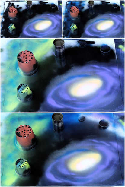 A partir de negro, crear un vacío oscuro entre la galaxia espiral y alrededor de los planetas flotantes utilizando el método de niebla suave. Entonces usando azul metálico, limón verde y morado, rocíe suavemente algunos colores de luz por el espacio oscuro que fluye. Manteniendo la boquilla por lo menos 12" sobre el papel de crear transiciones más suaves.
