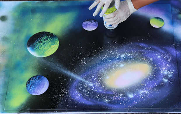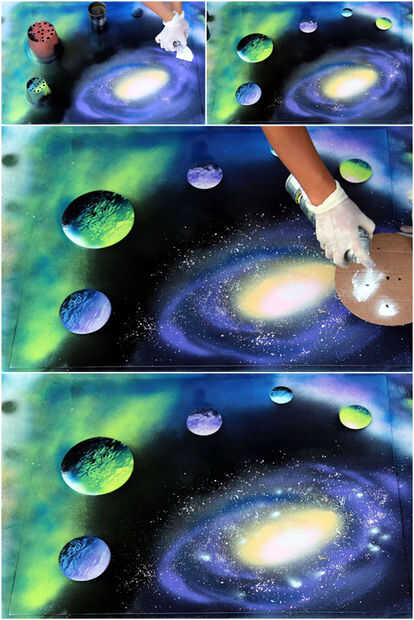 Ahora podemos levantar las tapas y pasemos a los pasos finales y super divertidos: estrellas! Algunos pintura blanca sobre un pequeño trozo de papel grueso de aerosol, debe haber suficiente pintura todavía no es mucho lo gotea. Cara del papel hacia abajo donde quieres que nos tienen las estrellas y toque con los dedos en la parte posterior del papel para crear racimos de estrellas.