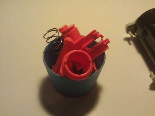 Utilice su tweaker para destornillar todos los tornillos en el depósito de armas y ponerlas aparte en un lugar seguro donde ninguno de ellos va rodando (lo último que desea no es poder volver a poner su arma a) Levante suavemente la pistola aparte y verás el hermoso naranja y brillante color plástico que conforma el funcionamiento interno de su arma!