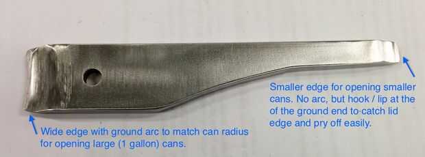 Las ideas clave del diseño es que cuenta con un borde ancho para obtener un mayor agarre debajo de la tapa de la lata de pintura (presión de extensión a través de un área más amplia), un labio hacia arriba en la punta para ayudar a sujetar la tapa, y un arco de tierra en la parte ancha del borde que permite que la herramienta conectar sin problemas con la tapa redonda.