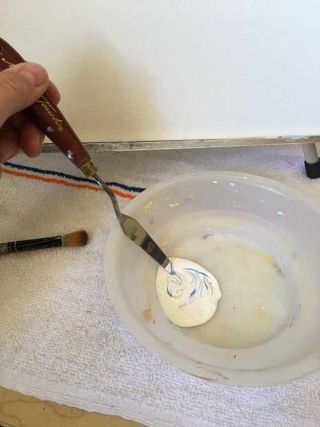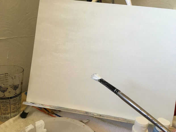 Mezclar un pequeño toque de pintura azul en algunos pintura blanca, mezcla bien. Pintar el lienzo entero con este color azul pálido.