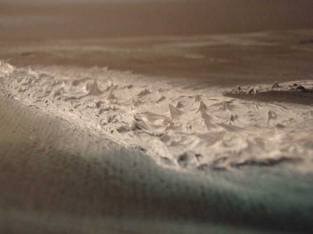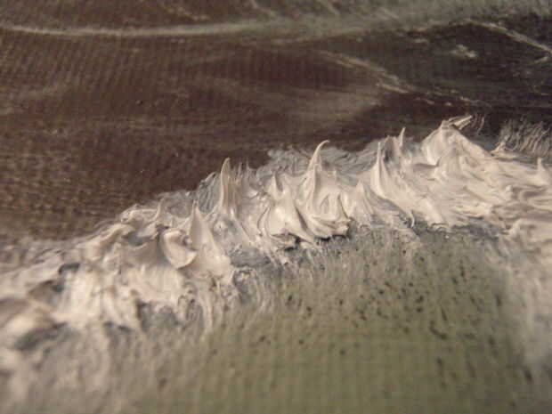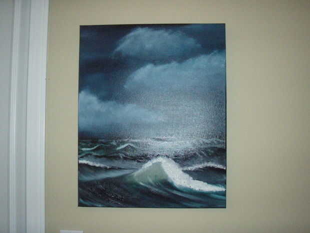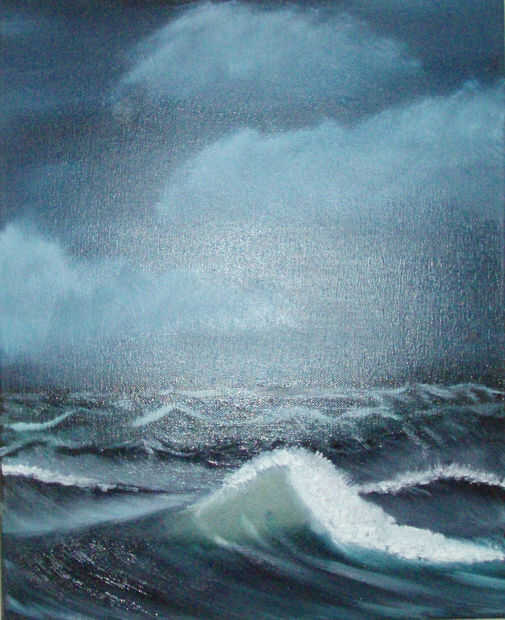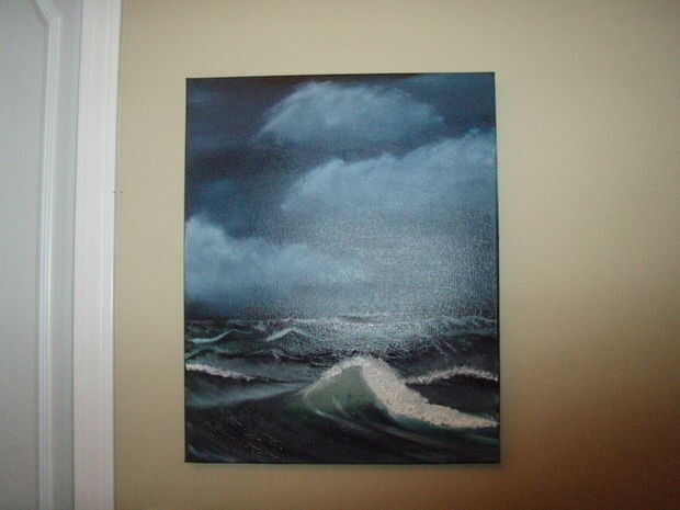 Esta es mi primera pintura al óleo de siempre! Pintó siguiendo uno de los programas de pintura de Bob Ross, donde pintó un paisaje de agua llamado "Justo antes de la tormenta". Mina resultó al parecer durante una tormenta, por lo tanto el título, tormenta del mar. Dio la espuma sobre las olas un efecto "3D", pintura en espesor, tenues toques.